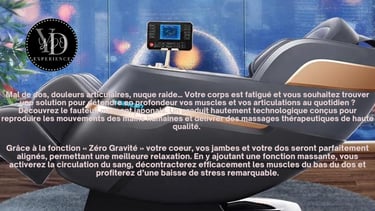 - Les massages dans un fauteuil zéro gravité : profitez d’une expérience unique combinant confort optimal et massages ciblés pour une sensation de légèreté et de bien-être total.