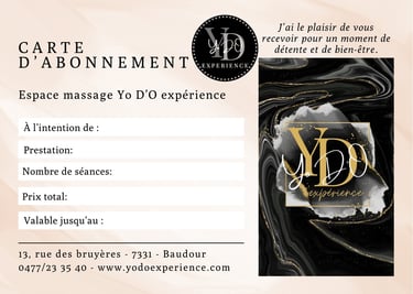 Afin de rendre chaque visite encore plus agréable, Yo D’O Expérience propose plusieurs avantages et programmes de fidélisation : cartes de réduction, abonnements, cartes de fidélité, cartes de parrainage et même de petits cadeaux de la marque offerts selon les occasions. Ces attentions font partie intégrante de l’esprit du centre, où bien-être et générosité vont de pair.