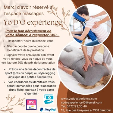 Chez Yo D’O Expérience, chaque massage est unique, conçu avec professionnalisme, écoute et attention — pour vous offrir une expérience parfaitement adaptée à vos besoins.